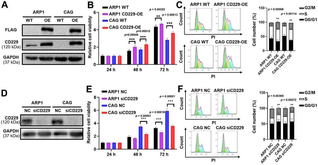 To determine whether CD229 could function as a contributing factor for MM cell proliferation, CD229 was overexpressed (OE) in MM cells through lentiviral transfection, as confirmed by Western blotting (WB) (Figure 2A and Supplementary Figure 1A, 1B). MTT assay showed that the proliferation of CD229-OE MM cells was significantly enhanced compared to wildtype (WT) cells (p < 0.01) (Figure 2B). Cell cycle analysis demonstrated that the proportion of G2/M phase in CD229-OE MM cells was evidently higher than that in WT cells (p < 0.01) (Figure 2C). Inversely, CD229 was knocked down (KD) by CD229-targeting siRNA, as validated by WB (Figure 2D and Supplementary Figure 1C). CD229-KD MM cells displayed significantly lower cell growth rates than the negative control (NC) cells (p < 0.001) (Figure 2E). In addition, the cell cycle analysis showed an obviously lower proportion of G2/M phase in CD229-KD MM cells compared to NC cells (p < 0.01) (Figure 2F). Taken together, these findings further indicate that CD229 stimulates MM cell proliferation.