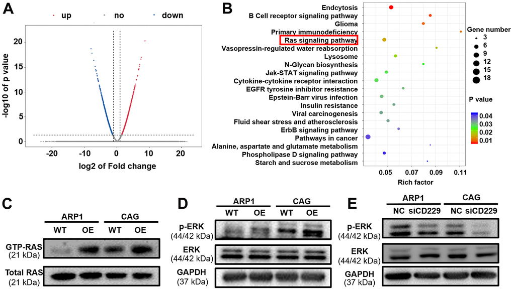 To further explore the mechanism by which CD229 affected MM cell proliferation, we prepared RNA samples for transcriptomic RNA sequencing (RNA-seq) to screen differentially expressed genes between CD229-OE cells and their corresponding WT cells. In total, we found that 236 genes were upregulated and 254 genes were downregulated in CD229-OE MM cells compared to WT cells (Figure 3A). As shown in Figure 3B (see Supplementary Table 1 for statistics of top 30 enriched pathways), the KEGG pathway enrichment analysis elucidated that multiple signaling pathways were significantly enriched, such as Endocytosis, B Cell receptor signaling pathway, Primary immunodeficiency and RAS signaling pathway. Among them, the RAS signaling pathway was most closely related to tumor development. Then we examined the RAS-GTP as well as total RAS expression. Intriguingly, the results showed that RAS-GTP but not total RAS was increased in CD229-OE MM cells (Figure 3C and Supplementary Figure 1D, 1E). Furthermore, we examined total ERK and phosphorylated ERK (p-ERK) levels in WT and CD229-OE MM cells. The results showed that p-ERK levels were increased in CD229-OE MM cells and decreased in CD229-KD MM cells, while no obvious changes were observed in the expression of total ERK (Figure 3D, 3E and Supplementary Figure 1F–1I). The above data provide the evidence that elevated expression of CD229 can activate RAS/ERK pathway to induce MM cell proliferation.