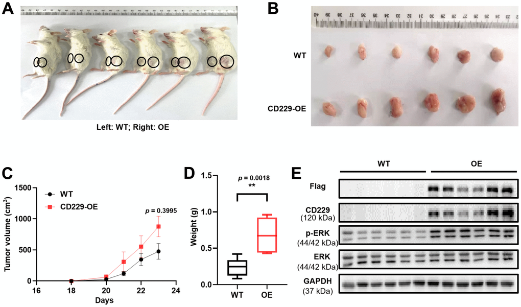As to confirm the oncogenic role of CD229 in vivo, the xenograft mouse model was constructed in the immunodeficient NOD/SCID mice by subcutaneous injection of WT and CD229-OE MM cells into the left and right flank of mice, respectively. Interestingly, we observed that the volume of the abdominal tumor formed by CD229-OE MM cells appeared larger than those formed by WT MM cells (Figure 4A–4C). Similarly, the tumor weight in CD229-OE group was significantly higher than that in WT group (p < 0.01) (Figure 4D). To further verify the activation of RAS/ERK pathway by CD229 in vivo, the CD229 and p-ERK expressions of the excised tumor were detected by WB assays. The in vivo results showed that CD229 was stably overexpressed and p-ERK was activated in CD229-OE group compared to WT group (Figure 4E), suggesting a critical role of CD229 on RAS/ERK pathway.