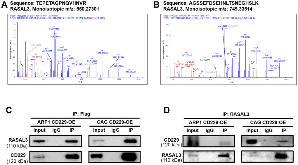 To further explore how CD229 activated RAS, we performed Co-IP coupled with MS (Co-IP/MS) to screen the client proteins. Among these CD229-regulated proteins (see Supplementary Table 2 for Co-IP/MS data of the selected 561 proteins), two peptide fragments corresponding to a protein named RAS Protein Activator Like 3 (RASAL3) (Figure 5A, 5B) ranked the top of these client proteins. It is reported that RASAL3 contains the RasGAP domain for active RAS hydrolysis [24]. Therefore, we inferred that RASAL3 might be an important downstream protein of CD229. Co-IP experiments using FLAG antibody in CD229-OE cells confirmed the interaction between CD229 and RASAL3. Meanwhile, the IP using RASAL3 antibody could also precipitate CD229, further indicating that RASAL3 interacted with CD229 (Figure 5C, 5D). Therefore, it is reasonable to speculate that CD229 regulates the RAS/ERK signaling pathway by directly interacting with RASAL3.