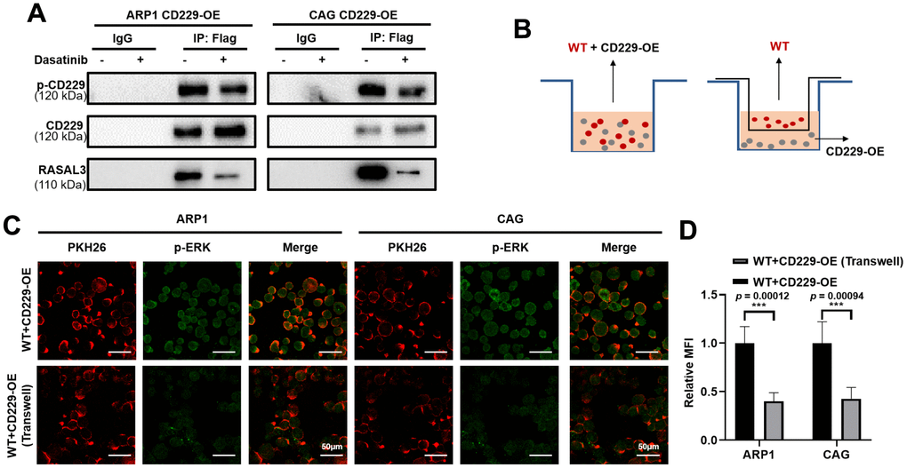It has been reported that CD229 signal transduction requires phosphorylation of the immune receptor tyrosine signal motif (ITSM) [20, 25]. We next suppressed CD229 activity using Dasatinib, a tyrosine kinase inhibitor on protein tyrosine phosphorylation [26, 27]. Co-IP experiments verified that phosphorylation of CD229 and expression of RASAL3 were blunted after Dasatinib treatment in CD229-OE MM cells, indicating the impaired interaction between CD229 and RASAL3 (Figure 6A). To further confirm the activation mode of CD229 in MM cells, we co-cultured PKH26-labeled WT MM cells with CD229-OE MM cells using transwell chambers (Figure 6B). Downstream p-ERK expression was detected by immunofluorescence assay, and higher p-ERK levels were observed in the directly mixed MM cells than the cocultured cells from transwell chambers (Figure 6C, 6D). These findings suggest that tyrosine phosphorylation-mediated CD229 self-activation activates the downstream RAS/ERK pathway by interacting with RASAL3 (Figure 7).