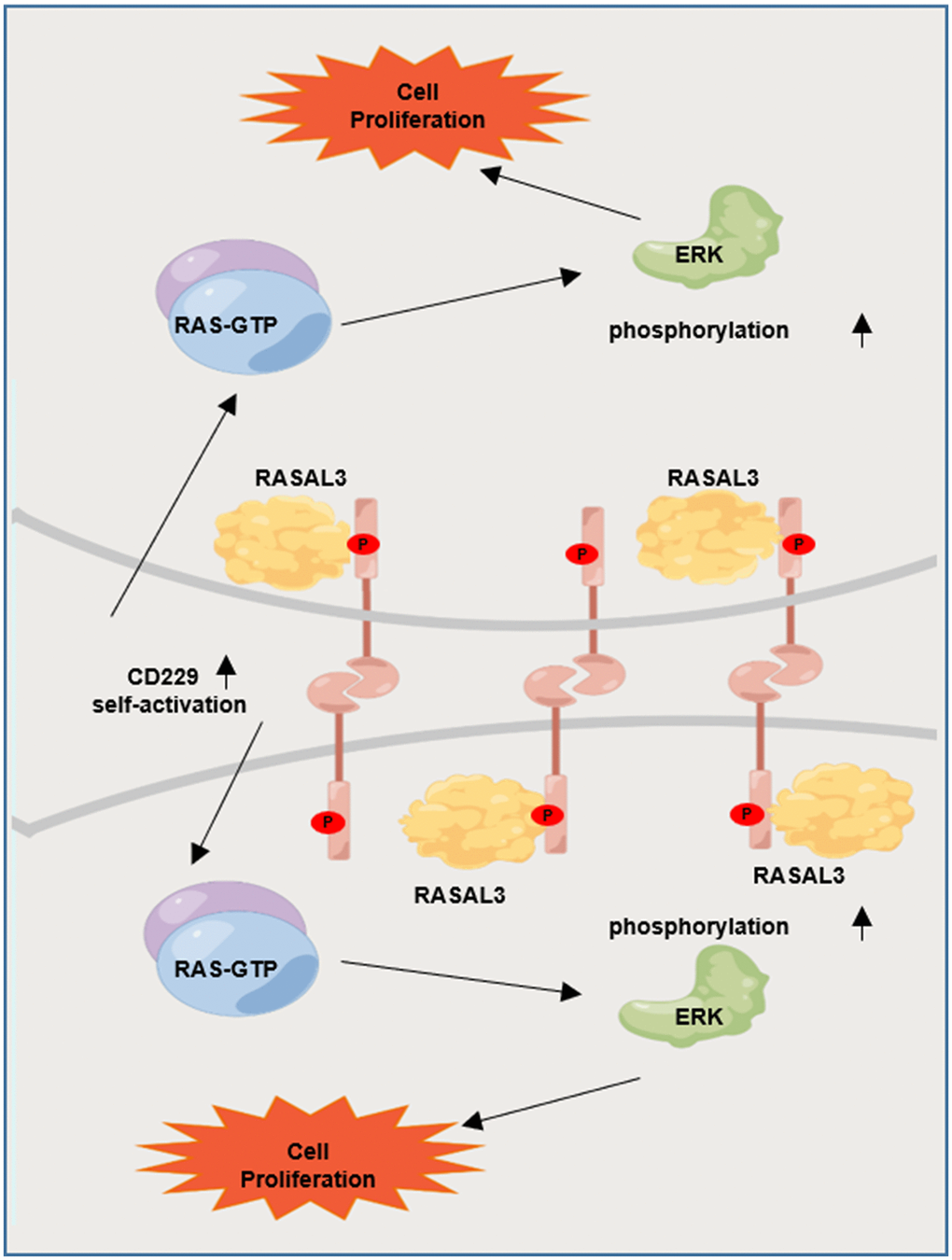 In conclusion, the present study reveals that elevated CD229 expression confers poor survival in MM patients and promotes cell proliferation both in vitro and in vivo. Mechanistically, CD229 interacts with RASAL3 upon tyrosine phosphorylation-mediated self-activation, thus activating the RAS/ERK signaling pathway. Our study not only demonstrates the oncogenic role of CD229 in MM cell proliferation, but also illustrates the new theoretical basis on CD229 as a promising therapeutic target for the treatment of MM.
