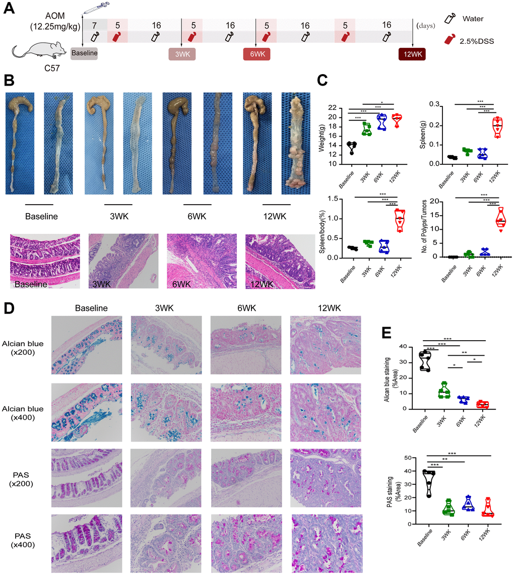We first induced a mouse model of inflammation-based tumorigenesis using AOM and DSS (Figure 1A). The intestinal conditions of the mice were observed at the start of the study and at 3 weeks, 6 weeks and 12 weeks after treatment. During the study, the size and number of gross polyps increased substantially (Figure 1B). In addition, compared with healthy baseline mice, AOM-DSS-treated mice exhibited a progressive increase in spleen-body ratio (Figure 1C). Histological analysis showed that the AOM-DSS model reproduced the progression from chronic inflammation to colorectal adenoma to colorectal carcinoma in situ at different time points (Figure 1D). Further pathological staining analysis showed that steady-state molecules were gradually reduced and that mucosal integrity was gradually lost during the inflammatory tumorigenesis process (Figure 1E). These results indicated that the model of inflammation-based tumorigenesis in mice was successfully constructed and provided a basis for the transcriptome study of different pathological tissues in the progression of colorectal cancer.
