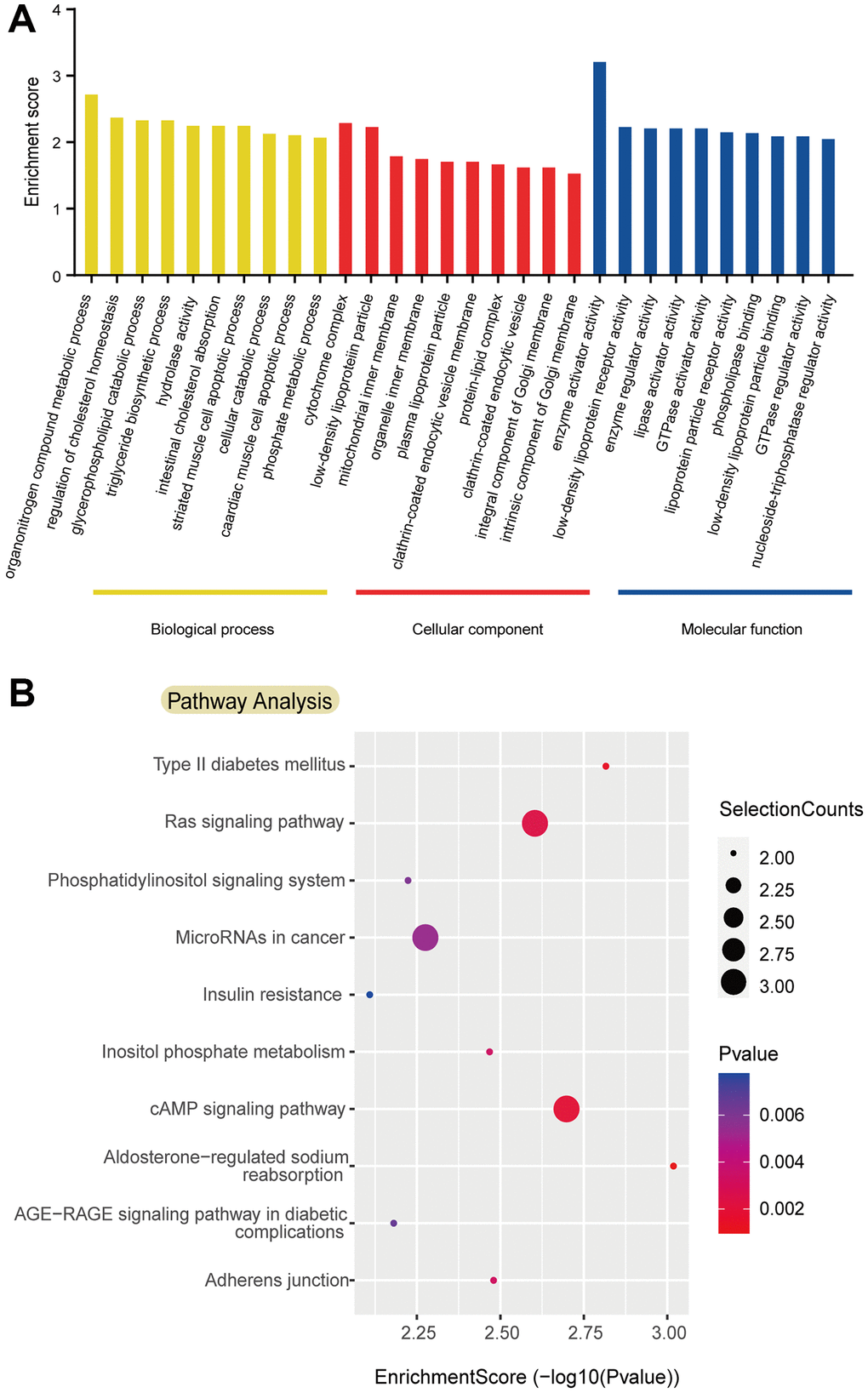 Functional annotation GO enrichment analysis of persistent upregulation/downregulation of circRNAs comprises three parts: cellular component (CC), biological process (BP), and molecular function (MF). The top ten terms were enumerated in the related functional area (Figure 3A). KEGG pathway enrichment analysis revealed the 10 pathways among persistently altered circRNAs. It is noteworthy that the “Ras signaling pathway”, “microRNAs in cancer” and “cAMP signaling pathway” play important roles in the disease process (Figure 3B).
