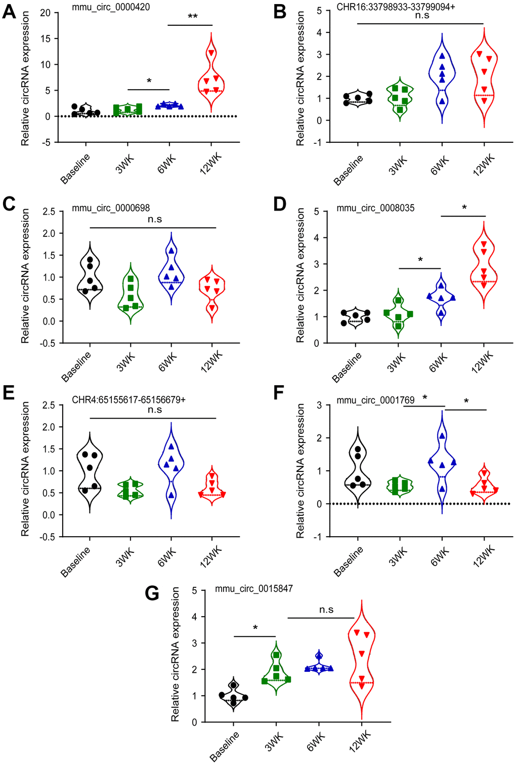 For the two circRNAs with significant changes in disease progression in the animal models, we conducted an analysis of circRNAs homology in humans and mice in the database. The circRNAs in the human genome corresponding to two circRNAs in mice were analyzed, including six circRNAs corresponding to mmu_circ_0000420: hsa_circ0101338, hsa_circ0033474, hsa_circ0033473, hsa_circ0033472, hsa_circ0033471, and hsa_circ008780 and four circRNAs corresponding to mmu_circ_0008035 in humans: hsa_circ0022429, hsa_circ0022428, hsa_circ0022427, and hsa_circ0022426. (Figure 5A, 5B).