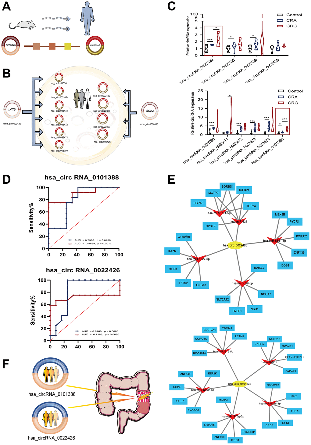 In conclusion, our study was based on the analysis of circRNA expression levels in colorectal tissues of mice at different pathological stages of inflammatory cancer transformation, combined with the homology transformation of circRNA in mice and humans, and finally verified by clinical samples. We found that hsa_circRNA_0101388 and hsa_circRNA_0022426 have potential predictive value for the early emergence of colorectal cancer. Our results may provide new biomarkers for predicting the occurrence of colorectal cancer inflammatory cancer transformation. Validation of larger samples is necessary to confirm these findings, and subsequent studies will further explore the biological functions of these potential circRNAs in the development of CRC.