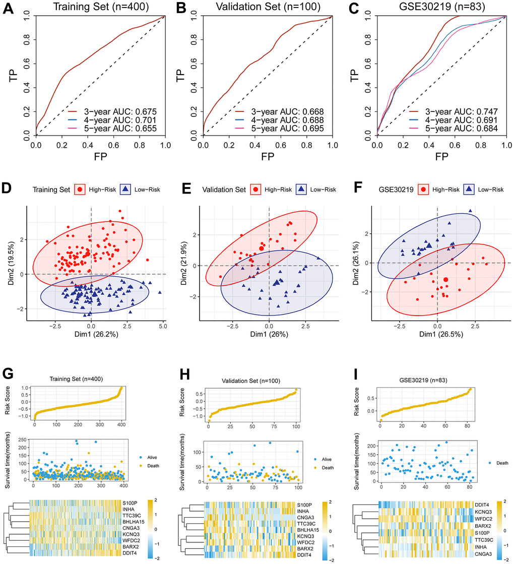 The capability of the CR-related signature was assessed in the discovery cohort (n = 400), the validation cohort (n = 100) and GSE30219 (n = 83). Three-year AUCs were 0.701, 0.688 and 0.691 in the discovery cohort, the validation cohort and GSE30219, respectively (Figure 2A–2C), suggesting its robust predictive ability for predicting prognosis.