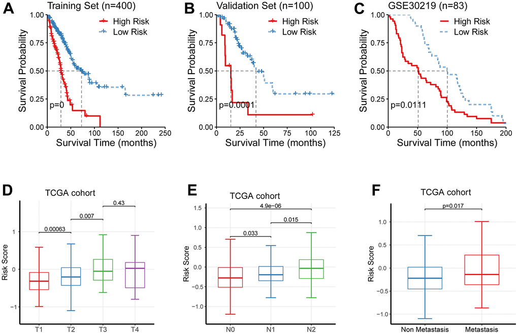We further interrogated the link between the newly-established signature and TNM staging, and observed that the risk levels were significantly augmented in patients of higher TNM staging (Figure 3D–3F).