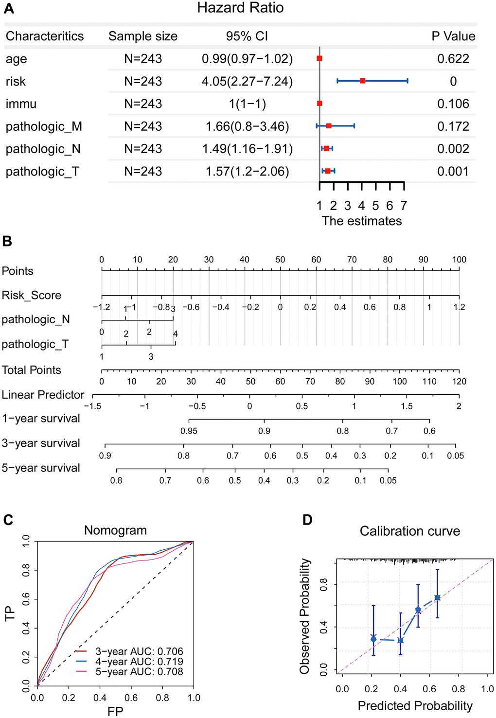 Afterwards, we constructed a prognostic nomogram combining the risk score, pathological N, and pathological T (Figure 4B), which can be used to accurately predict the patients’ survival risk for precision medicine by calculating specific survival risk scores based on the risk score, pathological N, and pathological T. The ROC curve demonstrated an elevated forecasting performance, and five-year AUC value was 0.708 (Figure 4C). Accordingly, calibration curve revealed that the calculated probability line was highly compatible with observed probability line (Figure 4D).