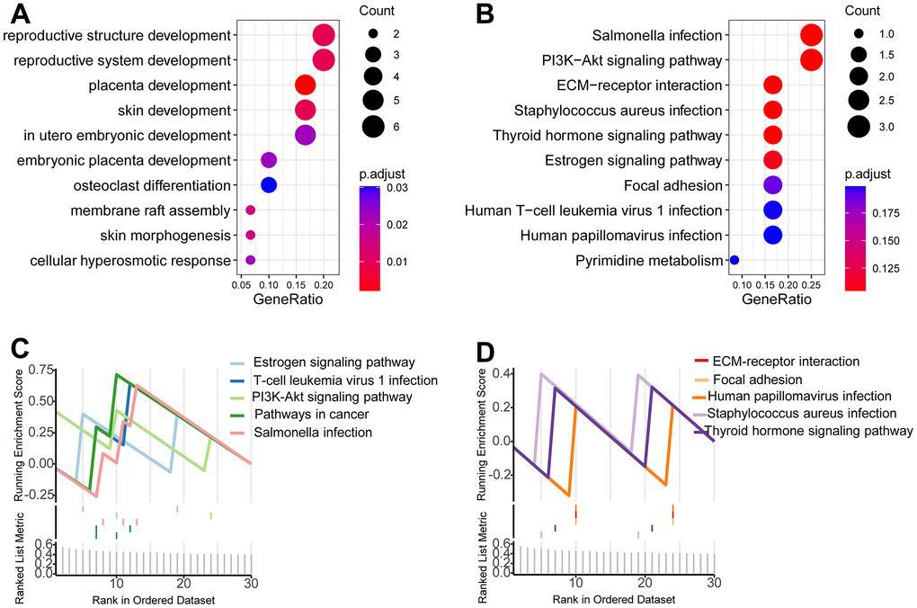 We first investigated the relationship of the newly-established signature with molecules using gene expression profiling. 123 genes were acquired as candidate genes. The 123 candidates were analyzed using clusterProfiler in R language. The findings showed that multiple cancer-associated pathways were identified (Figure 5A, 5B). Consistently, GSEA showed multiple cancer-associated pathways were significantly enriched in the high-risk patients (Figure 5C, 5D).