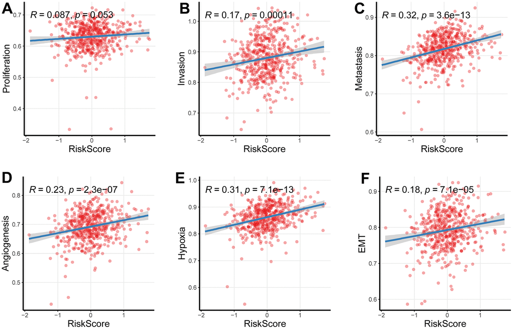Investigating the underlying mechanisms of the effects of the newly-established signature on cancer behaviors, we further assessed the association between the newly-established signature and hypoxia, epithelial-mesenchymal transition (EMT) and angiogenesis, which are all the potential causes of tumor metastasis. As we expected, the newly-established signature was implicated into the levels of hypoxia, EMT as well as angiogenesis (Figure 6D–6F).