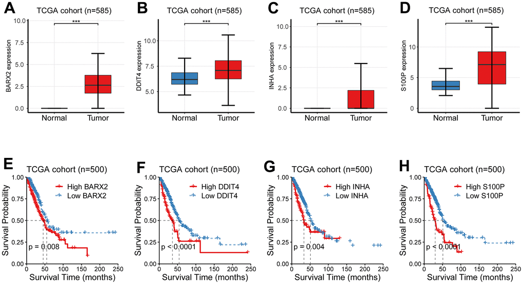 In addition, we analyzed the relationship between the survival status, the survival risk, and the mRNA levels; we observed that the hazard was linked to unwanted prognosis and high expression levels of four genes (BARX2, DDIT4, INHA, S100P) in the discovery cohort (Figure 2G), the validation cohort (Figure 2H) and GSE30219 (Figure 2I).