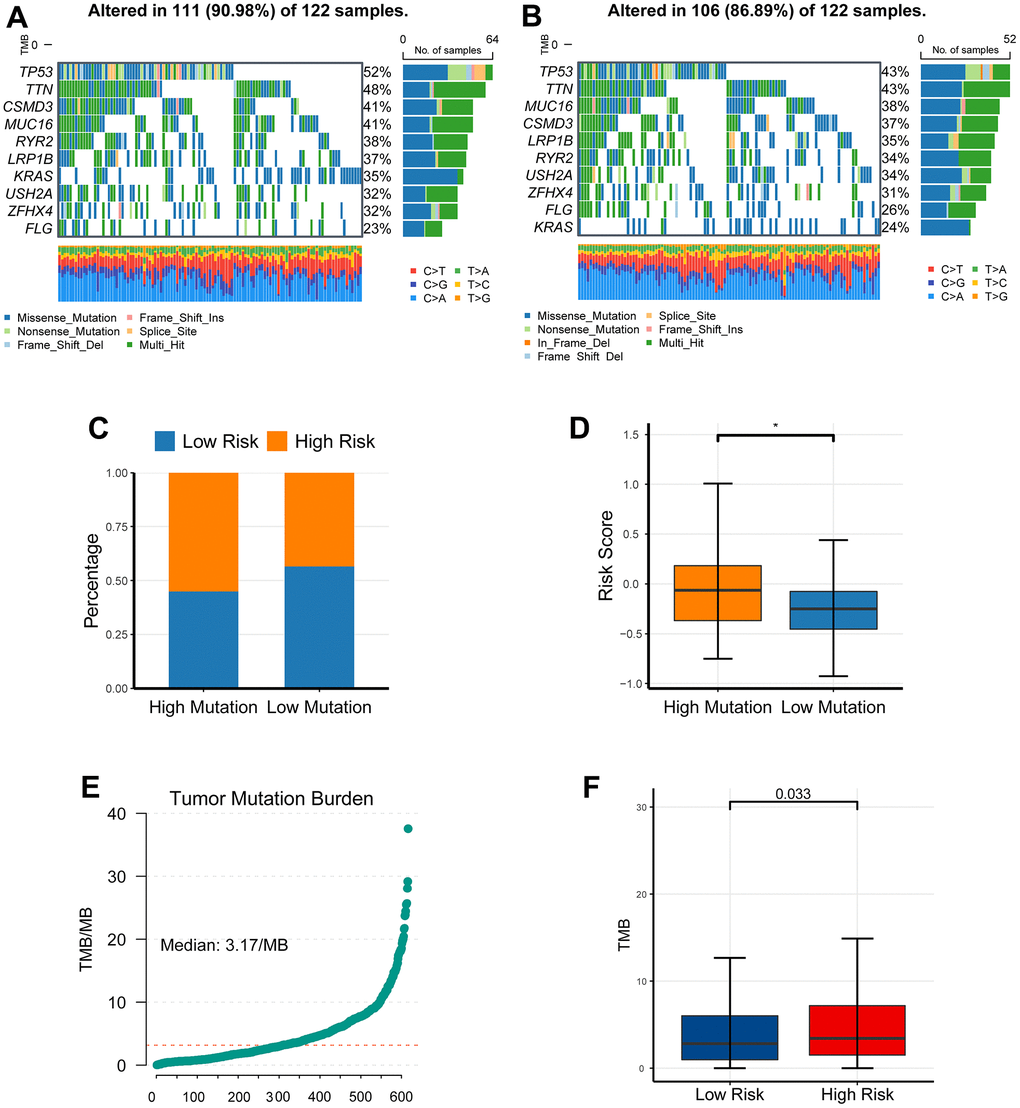 Comparing the difference of the mutation profiles between distinct risk cohorts, we set the top quarter patients as the high risk cohort and set the bottom quarter patients as its counterpart. The waterfall plot showed a distinct mutation rate between the low- and the high-risk cohorts (Figure 8A, 8B). Consistently, further analysis demonstrated that the high mutated cohort had a higher hazard than the low mutated cohort (Figure 8C, 8D). Tumor mutation burden (TMB) is recognized to be linked to immune checkpoint blockade [14, 15]; therefore, we analyzed the association between the hazard and TMB. TMB was estimated with maftool in R, and ranged from 0.02/MB to 37.54/MB (Figure 8E). In accordance with our expectation, TMB was significantly elevated in the high hazard cohort compared to its counterpart (Figure 8F).