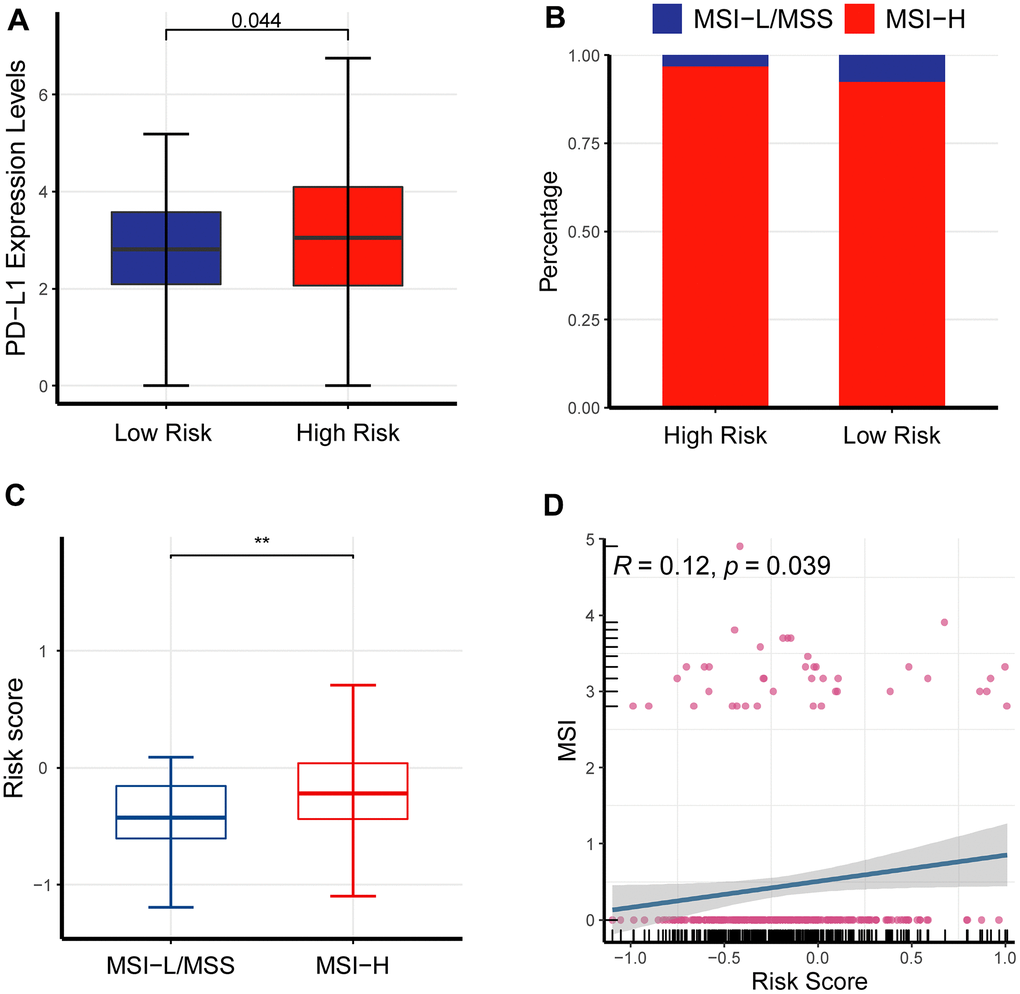 TMB, high-microsatellite instability (MSI-H) as well as PD-L1 have been associated with response to immune checkpoint blockade [16]. Herein, PD-L1 was overexpressed in the high-risk cohort than its counterpart (Figure 9A), implying the forecasting capability of the newly-established signature.