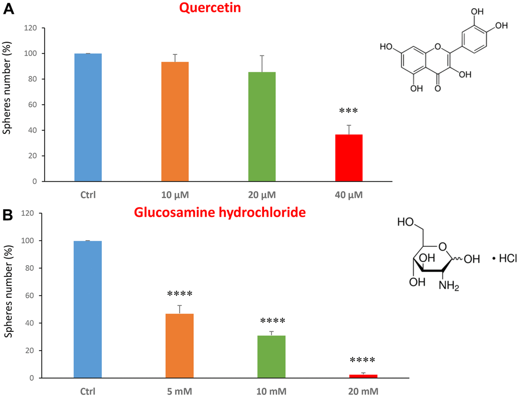 We first analysed CSC propagation after treatment with two dietary supplements: quercetin and glucosamine. Quercetin is a flavonoid present in vegetables, fruits and beverages. It has been extensively studied as a chemo-prevention agent in several cancer models [21–23]. It has anti-oxidant, anti-inflammatory and anti-cancer activities [24–30]. Glucosamine is a monosaccharide, precursor used for the glycosylation of proteins and lipids. It is naturally present, for example, in animal bones, bone marrow and the shells of shellfish.