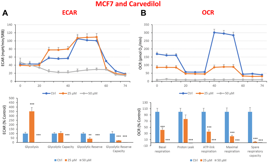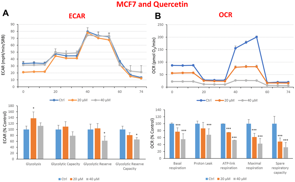 To evaluate the extracellular acidification rates (ECAR) and the oxygen consumption rates (OCR), we used the Seahorse XF96 metabolic flux analyser (Agilent Technologies, Inc.). Fifteen thousand MCF7 cells were seeded per well, into XF96-well cell plates, and cultured at 37° C in an incubator with a 5% CO2 humidified atmosphere. MCF7 cells were cultured in DMEM supplemented with 10% FBS (Foetal Bovine Serum), 2 mM GlutaMAX, and 1% Pen- Strep. After twenty-four hours from plating, the cells were incubated in the presence or absence of quercetin, glucosamine hydrochloride or carvedilol. After forty-eight hours, cells were washed in pre-warmed XF assay media, as previously described [19]. ECAR and OCR measurements were normalized by cellular protein content (SRB). Data sets were analysed using XFe-96 software and Excel, then Student’s t-test calculations were performed. All experiments were performed in sextuplicate and repeated three times independently.