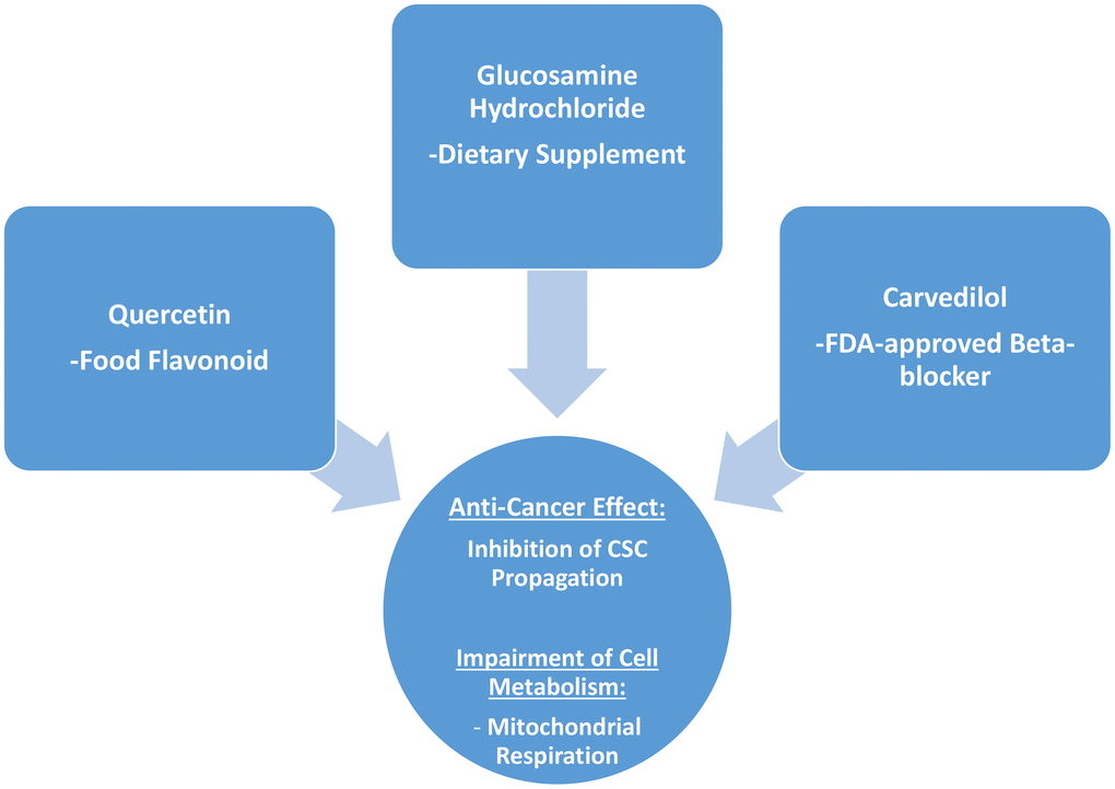 Finally, we focused on the metabolic effects in MCF7 cells of the most promising compounds, two dietary supplements, quercetin and glucosamine, and of the FDA-approved drug, carvedilol. We used the Seahorse XFe96 Analyzer to measure the oxygen consumption rate (OCR) and the glycolysis (ECAR). Our results show that these three compounds can significantly interfere with cancer cell metabolism, resulting in the suppression of CSC propagation. Therefore, we believe that these compounds should be investigated further.