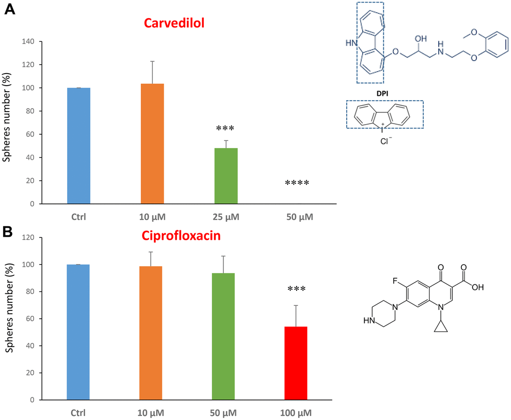 We tested carvedilol at the concentrations of 10, 25 and 50 μM. The IC50 was 25 μM and the highest dose was so potent as to completely block the mammosphere formation (Figure 2A). However, ciprofloxacin was less potent, with an IC50 of approximately 100 μM (Figure 2B).