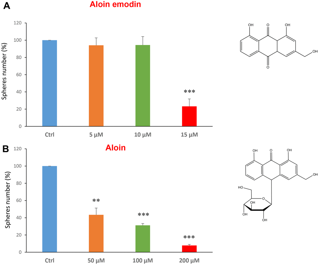 Aloin (or barbaloin) is a natural anthraquinone extracted from the plant aloe latex and together with aloe emodin, that lacks a sugar group compared to the first, is widely used as an anti-inflammatory and shows anti-cancer activity [34]. Figure 3A shows that aloin emodin at the concentration of 15 μM was effective in reducing CSC propagation by over 70%. Aloin was also effective at all three concentrations tested of 50, 100 and 200 μM (Figure 3B).