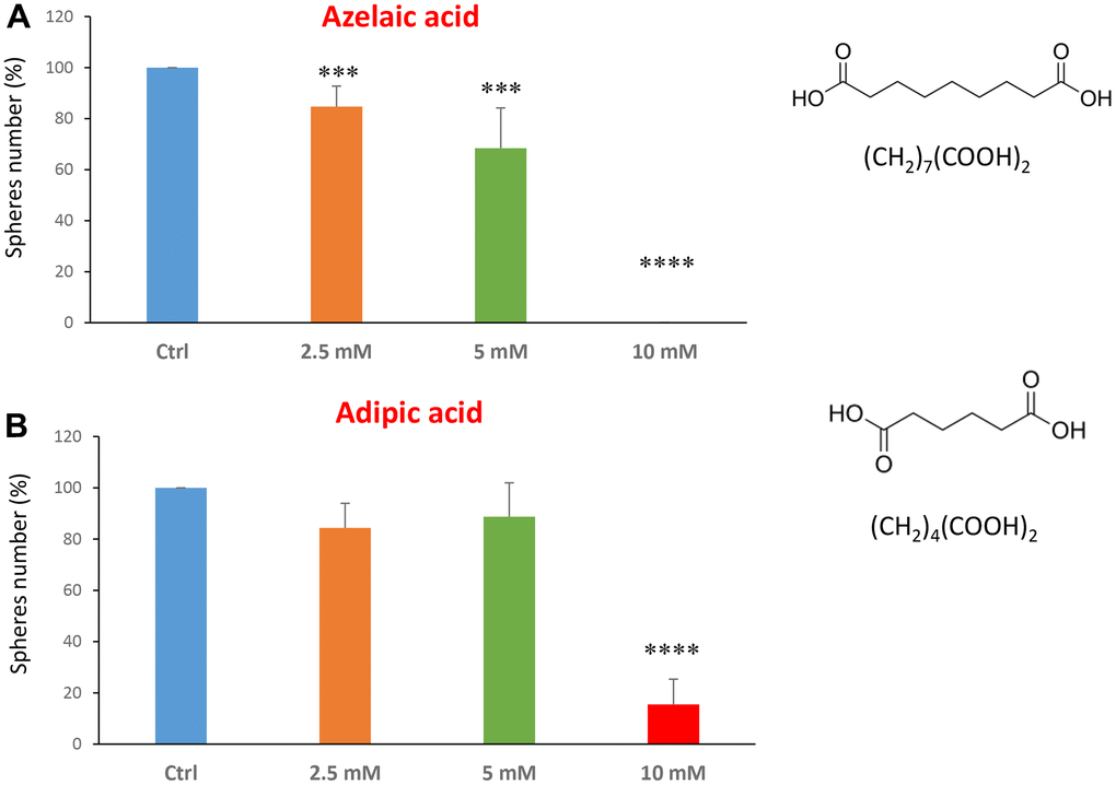 The last two compounds in this category were azelaic acid and adipic acid (Figure 5A, 5B). Azelaic acid is found in wheat, rye and barley. It inhibits mitochondrial enzymes of the respiratory chain and enzymes involved in DNA synthesis showing antiproliferative and cytotoxic effects in melanoma, bladder and breast cancers, and leukaemia [40–42]. Adipic acid is used mainly in the production of nylon and is also used as a food additive [43, 44]. Azelaic acid displayed effectiveness starting at a concentration of 2.5 mM, with an IC50 between 5 and 10 mM; note that at 10 mM the propagation of CSCs was completely halted. Similarly, adipic acid also showed promising inhibitory effects.