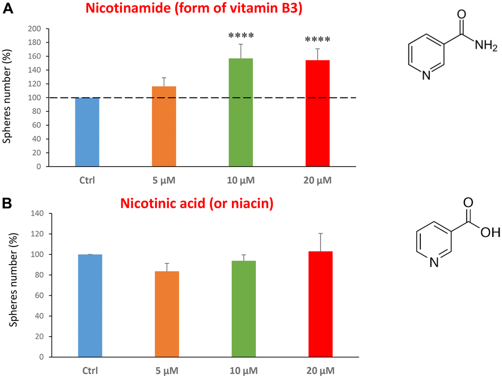 Finally, we assessed the effects of two common vitamins on CSCs proliferation: nicotinamide, which is the active form of vitamin B3, and nicotinic acid (a.k.a, niacin). Nicotinamide is an amide form of vitamin B3, and is found in foods like fish, poultry, eggs and is used as a dietary supplement/medication, to prevent and treat pellagra [45]. Nicotinic acid or niacin is the vitamin B3 and is used to reduce elevated levels of cholesterol [46]. Importantly, nicotinamide and nicotinic acid are both precursors of the co-enzymes nicotinamide adenine dinucleotide (NADH) and nicotinamide adenine dinucleotide phosphate (NADPH) [14]. Interestingly, treatment with nicotinamide significantly increased the CSC propagation, at concentrations of 10 and 20 μM. However, nicotinic acid did not show any significant effects at the doses tested (5, 10, or 20 μM) (Figure 7A, 7B).