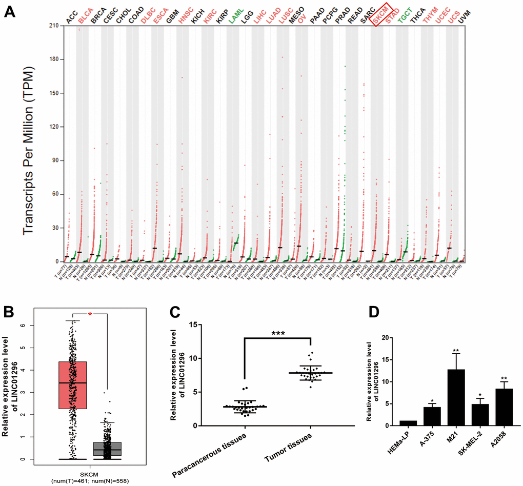 According to the analysis of the Gene Expression Profile Interactive Analysis (GEPIA) database, a high expression of LINC01296 was observed in a variety of cancers, including CMM (Figure 1A). Moreover, LINC01296 expression was markedly upregulated in cutaneous melanoma (SKCM) (Figure 1B, P<0.05), which was in accordance with the data of NCBI (https://www.ncbi.nlm.nih.gov/). We collected 30 pairs of CMM tumor tissues and adjacent non-cancerous tissues to further investigated the function of LINC01296 in CMM tumorigenesis, and we examined the expression level of LINC01296. Based on the results of qRT-PCR, it was shown in the Figure 1C, CMM tissues exhibited higher level of LINC01296, compared to adjacent non-cancerous tissues (P<0.001). Moreover, compared with human Epidermal Melanocytes, adult cell line HEMa-LP, LINC01296 was highly expressed in CMM cell lines (A-375, M21, SK-MEL-2 and A2058) to varying degrees, among which M21 cell lines exhibited highest expression level of LINC01296, whereas A2058 cell lines in the second (Figure 1D). In summary, our results showed that LINC01296 was markedly overrepresented in CMM tissues and cell lines, and it may serve as an oncogene in CMM.