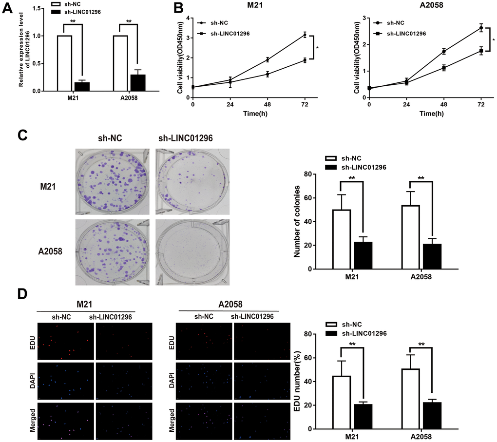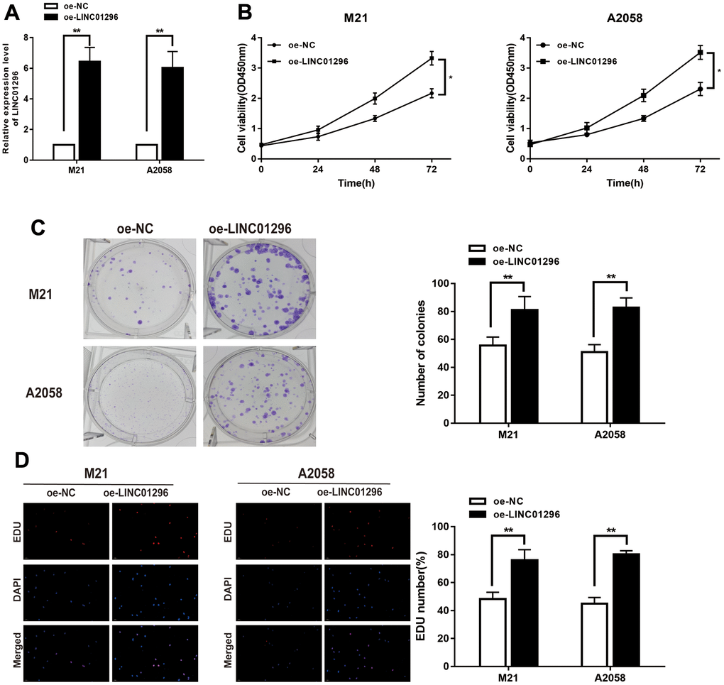 To further analysis, the knock-down model of LINC01296 with sh-LINC01296 and over-expression model of LINC01296 with oe-LINC01296 were established, in M21 and A2058 cells, respectively (Figures 2A, 3A, P<0.01). A further study regarding the biological effect of LINC01296 on the proliferative capacity of CMM, CCK-8 experiments showed that knockdown of LINC01296 suppressed the proliferation capacity of M21 and A2058 cells (Figure 2B, P<0.05). By contrast, overexpression of LINC01296 enhanced the proliferation capacity of CMM cell lines (Figure 3B, P<0.05). Similarly, cell proliferation was examined by colony formation assay, showing that cell colonies in the sh-LINC01296 group was much smaller than in the sh-NC group (Figure 2C, P<0.01), whereas cell colonies were markedly larger in the oe-LINC01296 group compared to the oe-NC group (Figure 3C, P<0.01). This fact highlights that LINC01296 enhanced the expansion capacity of CMM cell lines. Furthermore, the regulation of LINC01296 had a significant effect on proliferation rate of CMM cells, which was measured using EDU assay. Our findings revealed that the proliferation of M21 cells transfected with sh-LINC01296 was diminished (Figure 2D, P<0.01), whereas enhanced in M21 and A2058 cells transfected with oe-LINC01296 (Figure 3D, P<0.01). Taken together, these results suggested that LINC01296 possessed tumor-inducing activity in the progression of CMM.