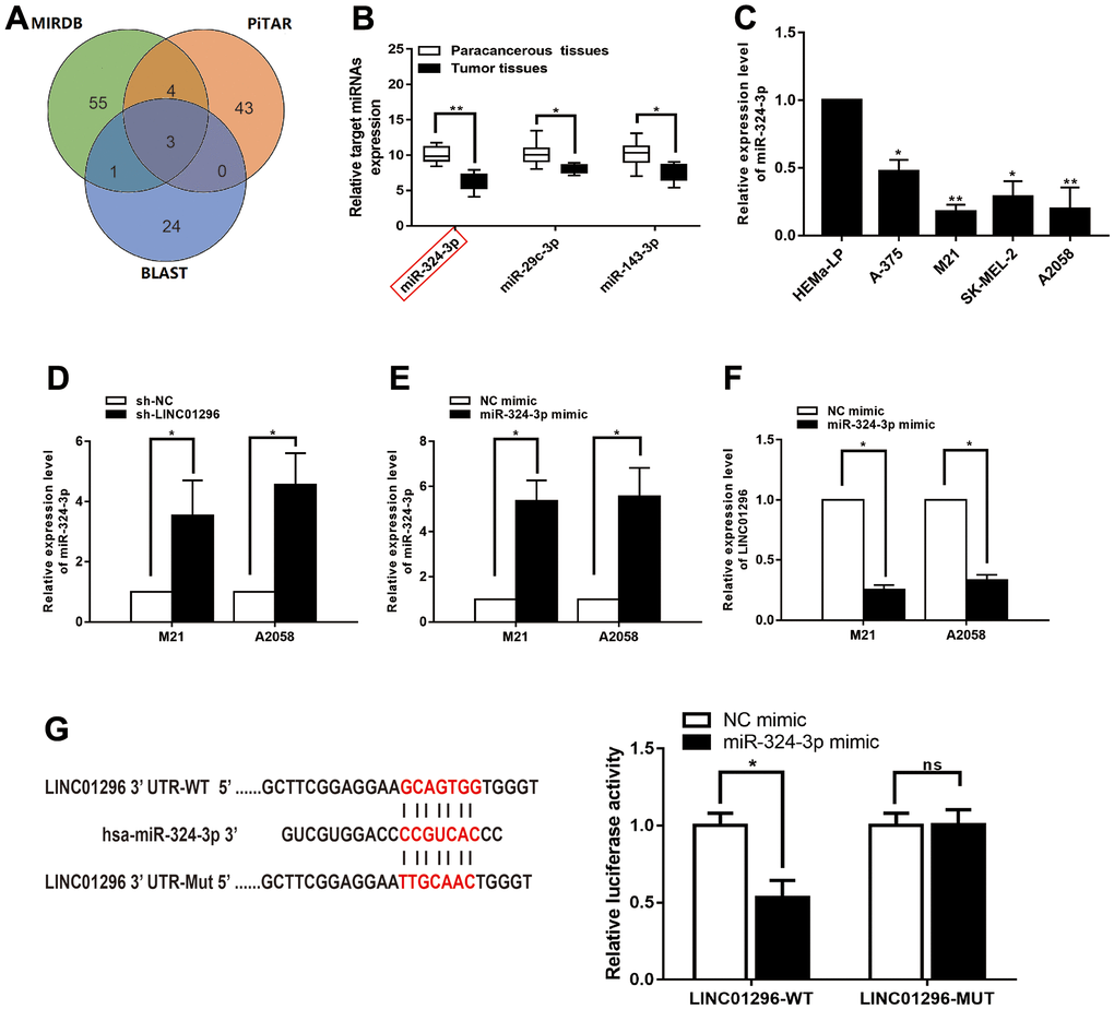Bioinformatics analysis (BA) showed that three potential conjugated miRNAs of LINC01296 were predicted, based on MIRDB, PITAR, and BLAST databases (Figure 5A). Among the three related miRNAs, miR-324-3p was significantly decreased verified in 30 CMM tissues compared with pair-normal tissues by qRT-PCR analysis (Figure 5B, P<0.01). Furthermore, qRT-PCR assay was utilized to validated miR-324-3p expression in CMM cell lines and found it was significantly decreased in M21 and A2058 cells (Figure 5C). We further investigated whether miR-324-3p was truly a ceRNA for LINC01296. In addition, we found that miR-324-3p expression was significantly upregulated in the knockdown model of LINC01296 (Figure 5D, P<0.05). Then, overexpression efficiency of miR-324-3p mimics in M21 and A2058 cells was tested by qRT-PCR analysis (Figure 5E, P<0.05), and miR-324-3p mimics could lead to downregulation of LINC01296 expression (Figure 5F, P<0.05). We used a dual luciferase reporter gene assay to evaluate whether LINC01296 acts on miR-324-3p. It can be seen in Figure 5G, the luciferase activity of cells transfected with miR-324-3p mimics was significantly declined than in the NC mimic group (P < 0.05), while no remarkable variation was observed in luciferase activity in cells transfected with miR-324-3p mimic in LINC01296-MUT group (P<0.05).