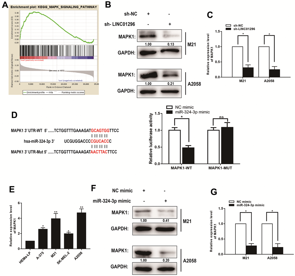 The lncRNAs have been shown to function critically in regulating the progression of CMM through MAPK signaling pathway. To determine the potential downstream genes that contributes to the effects of LINC01296 on CMM cells, we obtained mRNAs for potentially related genes of LINC01296 by BA. Moreover, we explored the signaling pathways that potential related mRNAs involved in by using Kyoto Encyclopedia of Genes and Genomes analysis. It is noteworthy that the MAPK signaling pathway was significantly altered in CMM, which was in accordance with the findings in vitro (Figure 6A). To test the effect of LINC01296 knock-down on MAPK signaling pathway, the results by Western blotting indicated that the knock-down of LINC01296 could blunt MAPK signaling pathway in both M21 and A2058 cells. Compared with sh-NC group, we exhibited the decreasing expression level of MAPK1 in both M21 and A2058 cells transfected with sh-LINC01296 group (Figure 6B). And as shown in qRT-PCR assay, the knock-down of LINC01296 resulted in the down-regulation of MAPK1 expression (Figure 6C, P<0.05). Finally, we performed dual-luciferase reporter gene assay, and the results found that the over-expression of miR-324-3p decreased the luciferase activity driven by MAPK1-WT in HEK293FT cells, but did not change the activity of MAPK1-MUT, which suggested that MAPK1 was a direct target of miR-324-3p (Figure 6D, P<0.05). In addition, further verification of MAPK1 was highly-expressed in M21 and A2058 cells by qRT-PCR (Figure 6E). Then, to validate the correlation between miR-324-3p and MAPK1, miR-324-3p mimic was established in M21 and A2058 cells, and the results by Western Blotting and qRT-PCR showed the decreasing expression level of MAPK1 in M21 and A2058 cells transfected with miR-324-3p mimic, which revealed that miR-324-3p could regulate MAPK1 level (Figure 6F, 6G, P<0.05).