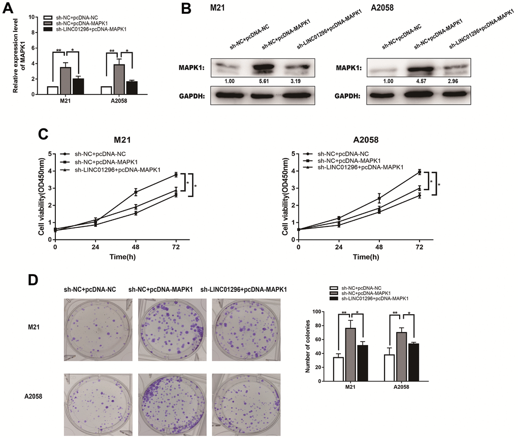 The expression level of MAPK1 of M21 and A2058 cells from different transfection groups were measured by qRT-PCR (Figure7A). MAPK1 expression levels were lower in sh-LINC01296+pcDNA3.1 group of CMM cell lines than that in sh-NC+pcDNA3.1 group, whereas they were obviously higher in sh-LINC01296+pcDNA3.1-MAPK1 group of M21 and A2058 cells. Western blotting showed a same phenomenon (Figure 7B). Functional assays, like CCK8 assays and cloning assays, were also carried out in different transfection groups of M21 and A2058 cells (Figure 7C, 7D). Based on the experimental results, it can be seen that MAPK1 expression has the ability to reverse the opposite effect of LINC01296 in CMM cells, suggesting that upregulation of LINC01296 can induce tumorigenesis in CMM by upregulating the miR-324-3p/MAPK1 axis.