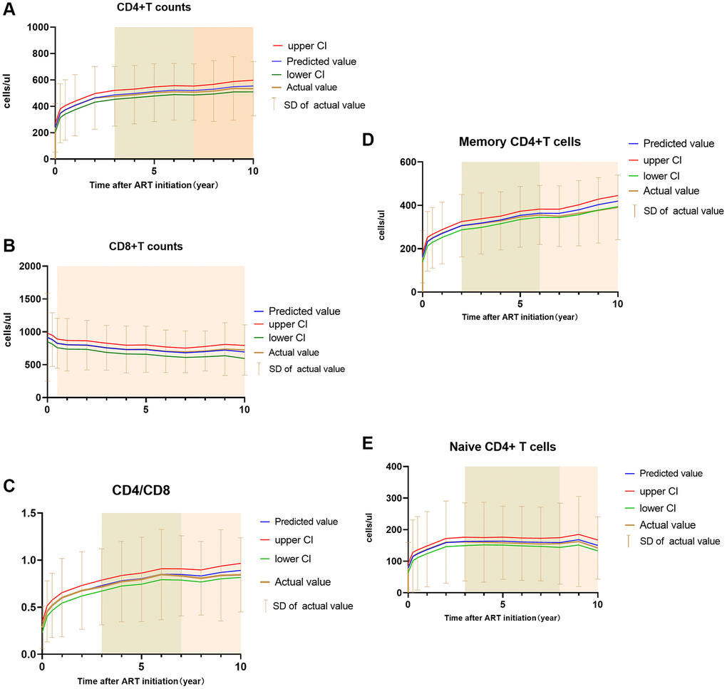 In general, our study showed longitudinal research of the kinetics of the T cell subsets reconstitution after 10-year ART. To our knowledge, this study provided largest sample size and longest time of T cell subpopulation change, which depicted the aging and the ART effect on the HIV-patients. Besides, we depicted the model of T cell subpopulation change over 10-years of ART with mixed linear model, considering the covariate effect including ART regimen and viral suppression as well as status at baseline, and comprehensively explained the data measured repeatedly.