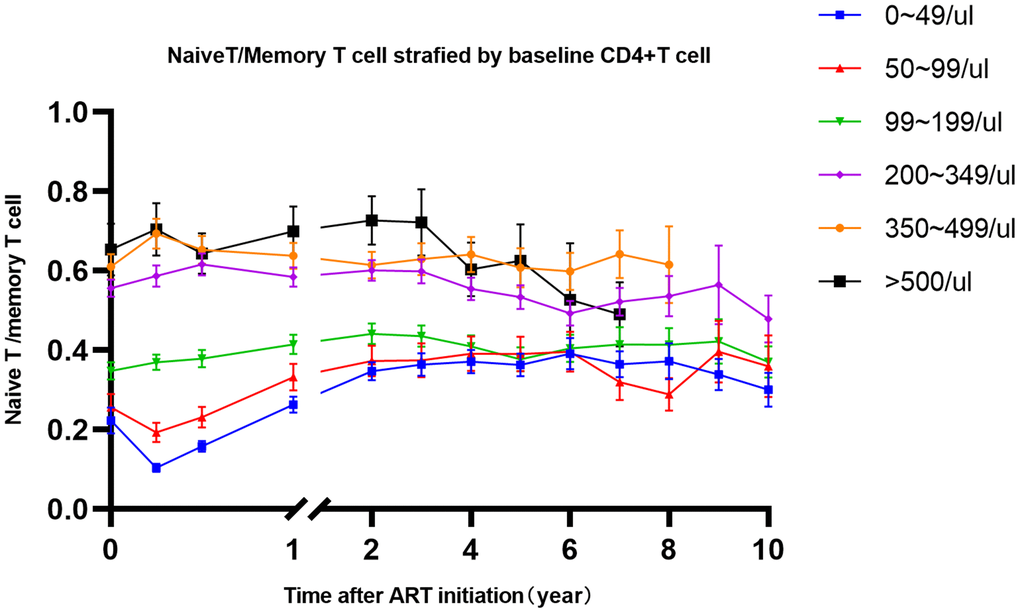 Comparing with cohort in European and other developed countries, the limitation of our study covered up the following: firstly, it is the relatively small sample size after long-term visit. The predictive role of pattern and kinetics of CD4+T cell count and other T cell subpopulations will be clearer with more subjects. Another limitation was that first-line recommended ART regimens have changed during the followed time. Therefore, CD4+T cell trajectory and T cell subsets change might be influenced by starting a different ART regimen. As current ART can be well tolerated and effective in viral control because of reduced side effects or tablets leading to improved adherence. Last but not least, we confirmed that among these indicators, age has a significant effect on the T cell subpopulation, especially CD28, CD45RA expression, but this effect on the healthy people did not have longitudinal data as HIV-infected patients, which may partly explain the difference between our study with others.