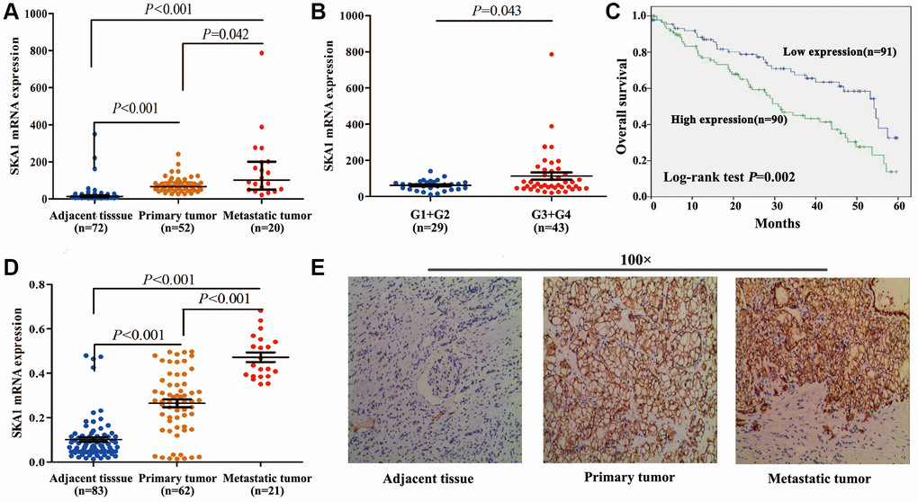 SKA1 mRNA expression in ccRCC samples was evidently higher than in their corresponding normal counterparts, especially greater in metastatic tumor tissues than in normal and original tumor tissues, according to our initial analysis of the available clinical data sets TCGA (N = 72) (Figure 1A) [15]. Moreover, in comparison to that in ccRCC tissues at lower grade (G1+G2), the SKA1 level was strikingly higher in advanced-grade (G3+G4) ccRCC tissues (Figure 1B). Moreover, the elevated SKA1 levels were closely associated with Fuhrman grade, AJCC staging and malignancy metastasis (TCGA-KIRC, N = 248) (Supplementary Table 1A). Next, the TCGA-KIRC, N = 181 using a log-rank test, the Kaplan-Meier curve revealed that patients with high SKA1 expression had worse overall survival (Figure 1C). In addition, we used ccRCC patient datasets (TCGA-KIRC, N = 181) to perform univariate and multivariate regression analyses. According to univariate and multivariate analyses, the data revealed that SKA1 expression was an independent predictor for survival of ccRCC patients (Supplementary Table 1B). These findings imply, in brief, that ccRCC metastasis is facilitated by high SKA1 expression and that poor patient survival is correlated with high SKA1 expression.