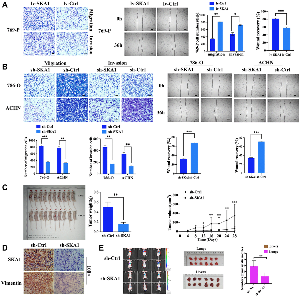 We selected 769-P to create cell lines that persistently overexpress SKA1 in order to probe further the oncogenic mechanism of SKA1 in ccRCC. Besides, 786-O and ACHN were chosen to construct the SKA1 stable knockdown cell line. Real-time PCR and western blot demonstrated SKA1 overexpression and knockdown (Supplementary Figure 2A and 2B). We discovered that upregulating SKA1 significantly improved the ability of 769-P cells to migrate and invade (Figure 2A). Correspondingly, RNA interference of SKA1 markedly decreased the mobility of tumor cells (Figure 2B). Apart from in vitro experiments, we used BALB/c mice (10 per group) for the subcutaneous tumor-bearing experiment and discovered that in comparison to the vector control group, the sh-SKA group’s tumor volume and weight were lower (P < 0.05). Furthermore, to determine if SKA1 can affect those malignant characteristics in vivo, a lung metastasis model was used. H&E staining results demonstrated that SKA1 knockdown in 786-O cells resulted in a significant reduction in the overall number of metastatic nodules in the lungs of nude mice (1.2 ± 0.8 nodes in the 786-O-sh-SKA1 group vs. 2.8 ± 1.0 nodes in the 786-O-sh-Ctrl group, t = 3.297, p = 0.008), although we didn’t find metastatic nodules in the liver of nude mice (Figure 2C and 2D). Consistently, lower SKA1 levels were detected in tumor sections derived from sh-SKA1-infected 786-O cells compared with their control counterparts. Immunostaining of vimentin (Figure 2E), a representative marker of cell mesenchymal phenotype, was weakened in tumor tissues from sh-SKA1-infected 786-O cells, which is consistent with in vitro results. Collectively, all these findings suggest that SKA1 has an apparent effect on the movement capacity of ccRCC cells.