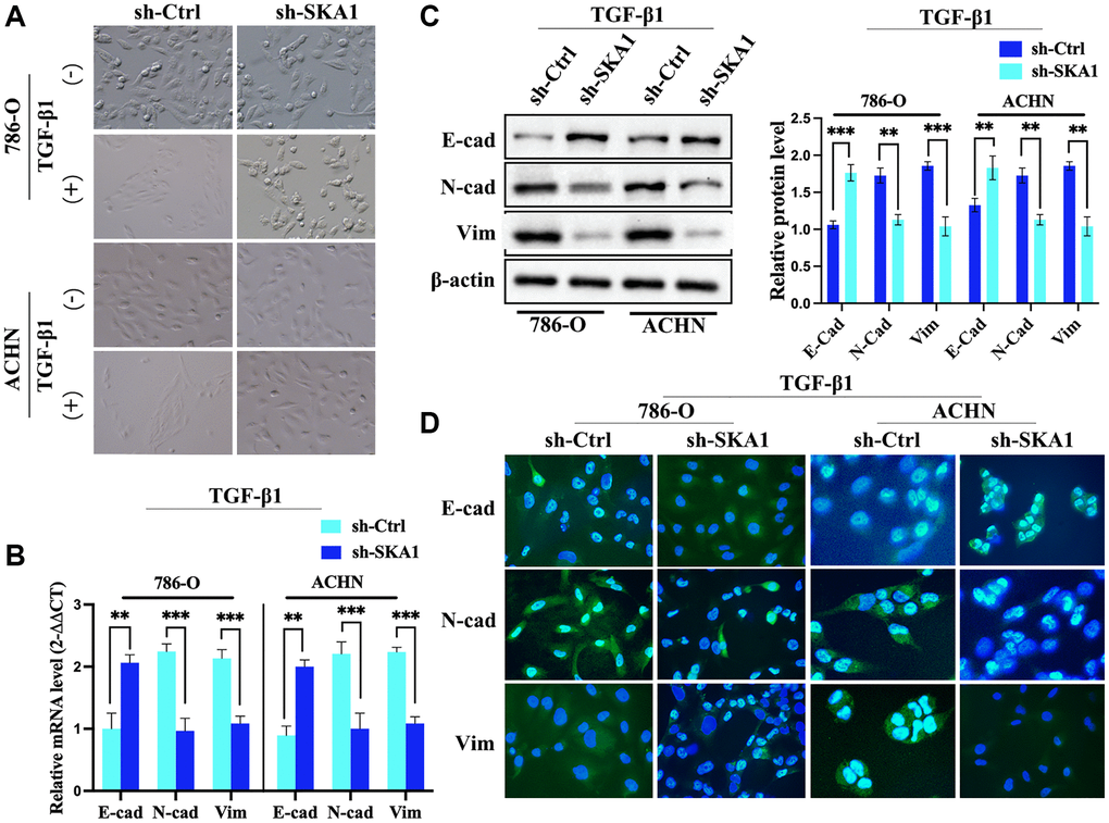 Erroneous EMT activation may result in tumor cell invasion, spread, and metastasis [16]. We examined the expression of EMT-related markers to learn more about SKA1’s function in the development of ccRCC. Control cells in a TGF-β1-induced EMT paradigm showed mesenchymal morphology after TGF-β1 treatment. In contrast, SKA1-depleted cells responded to TGF-β1 by maintaining their epithelial appearance (Figure 3A). The levels of genes connected to EMT were monitored for changes. In TGF-β1-treated ccRCC cells, lack of SKA1 increased the expression of the mesenchymal markers N-cadherin and vimentin while decreasing the amount of the epithelial marker E-cadherin, real-time PCR and western blot investigations (Figure 3B and 3C) reveal. Further confirmation of the elevation of E-cadherin together with a decrease in N-cadherin and vimentin in SKA1-depleted cells came from immunofluorescence analysis (Figure 3D). SKA1 is necessary for TGF-β1-induced EMT in ccRCC cells, to sum up.