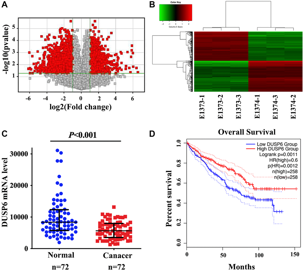 To better understand the variations in gene expression and probable causes of SKA1, we performed a genome-wide mRNA microarray study to compare the mRNA profiles of the sh-SKA1 and sh-Ctrl groups (Figure 5A and 5B). This gene microarray showed 535 differentially expressed gene transcripts (P < 0.05, Fold change ≧2.0) after data cleaning and filtering, when compared to the control group, 283 genes were upregulated and 252 genes were downregulated in the SKA1 silencing group (Supplementary Table 3A). Ingenuity Pathway Analysis (IPA) was utilized for relevant diseases and pathway analysis based upon differential expression genes. As shown in Supplementary Table 3B, GNRH signaling, known to be a crucial regulator in various types of malignancies [22–24], is the most significantly enriched pathway. The top five diseases and processes were angiogenesis, cell migration, cell movement, cell movement of tumor cell lines, and development of vasculature (Supplementary Table 3C). Additionally, the top 3 related networks encompassed organismal harm and abnormalities, gastrointestinal sickness, and cancer (Supplementary Table 3D). The MAPK phosphatase family member dual-specificity phosphatase 6 (DUSP6), may be a crucial effector for SKA1-mediated malignant progression of renal cell carcinoma based on the degree of connection between cancer cell motility and target genes, p-value, and fold change. A higher level of DUSP6 was observed in cases with abated expression of SKA1, and the converse is also true (Supplementary Figure 3A and 3B). To obtain pathological evidence, DUSP6 was first analyzed in the public ccRCC dataset from TCGA. It has been shown that DUSP6 was down-regulated compared to normal tissues in the ccRCC tissues (n = 72) (Figure 5C). Additionally, patients with low DUSP6 levels fared worse than those with high DUSP6 levels in terms of survival (P = 0.0011, obtained from the GEPIA, N = 516) (Figure 5D).