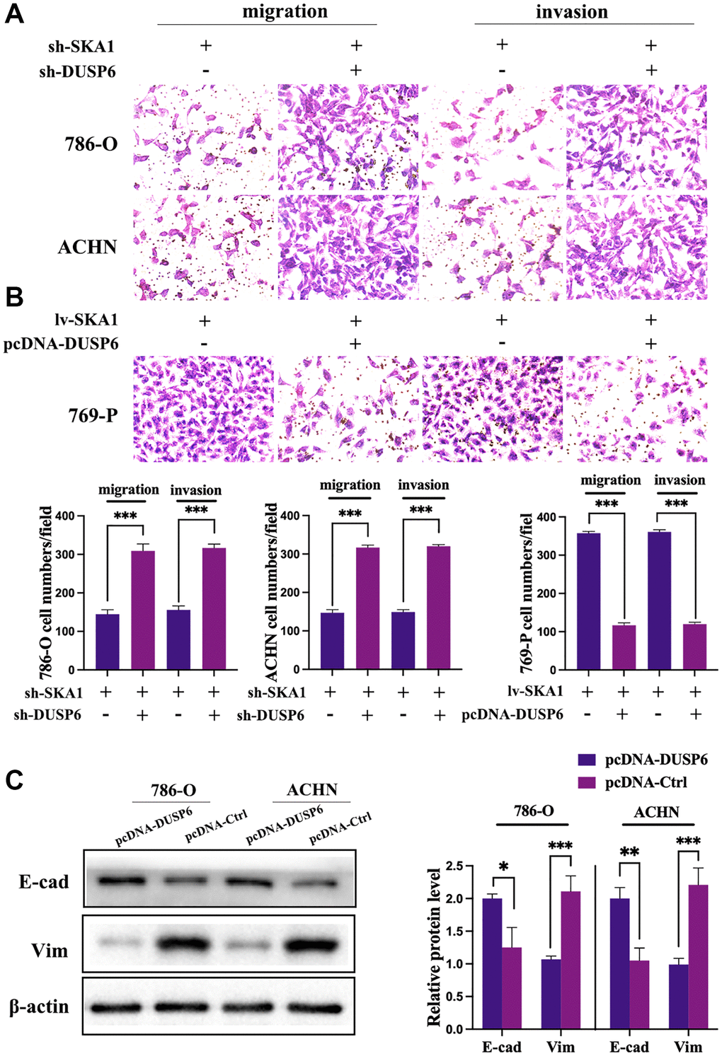 We came to the conclusion that since DUSP6 serves as a tumor suppressor in ccRCC, its overexpression may be to blame for the suppression of cancer cell migration and EMT brought on by SKA1 deficiency. The interference and overexpression efficiency of DUSP6 manipulated with the indicated plasmid was validated by qPCR and western blot (Supplementary Figure 4A and 4B). We discovered that DUSP6 knockdown restored the reduced invasive and migratory ability caused by SKA1 impairment (Figure 6A). DUSP6 expression plasmid co-infection, however, prevented the aggressive behavior brought on by SKA1 overexpression in ccRCC cells (Figure 6B). In both 786-O and ACHN cells, we also investigated DUSP6’s impact on variables associated with EMT. As seen in Figure 6C, in SKA1 over-expressed ccRCC cells, overexpression of DUSP6 lowered the quantity of vimentin and restored the amount of E-cadherin. The results suggested that SKA1-induced EMT was counteracted in DUSP6-positive cells. To sum up, these findings testify that SKA1’s ability to encourage the spread of cancer cells most likely works via suppressing DUSP6.