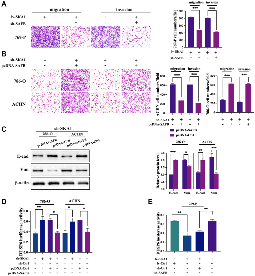 Due to SAFB’s primary role in transcriptional repression, which is to impede the formation of transcriptional complexes [21], we ask if the downregulation of DUSP6 is a consequence of SAFB-mediated transcriptional repression in ccRCC cells. In this case, we carried out a luciferase test, and reporter activity was adjusted to the Renilla control. The results showed that knockdown of SKA1 brought about the enrichment of DUSP6 luciferase activity, while the effect was neutralized by co-infected SAFB (Figure 7D). Conversely, enforced SKA1 deeply inhibited luciferase activity, and the inhibitions could be reversed by co-transfection of sh-SAFB. (Figure 7E). Taken together, these data corroborate that SKA1 physically interplays with SAFB, which induces SAFB-dependent transrepression of DUSP6, consequently promoting cancer aggressiveness.