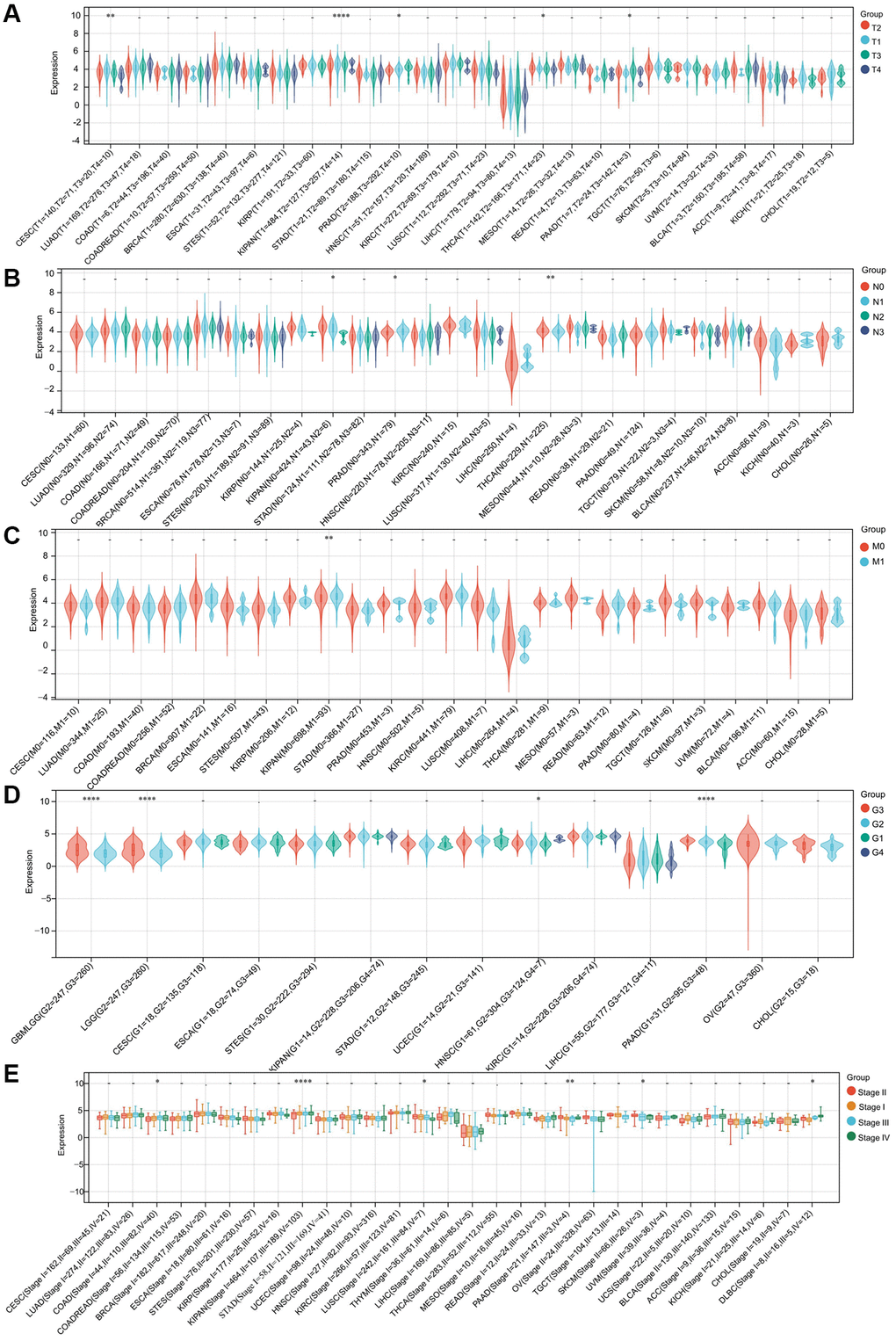 We used R software (version 3.6.4) to calculate the expression difference of genes in clinical stage samples from each tumor, and unpaired Wilcoxon Rank Sum and Signed Rank Tests to determine the significance of differences between pairs. Multiple groups of samples were compared using the kruskal.test statistic.