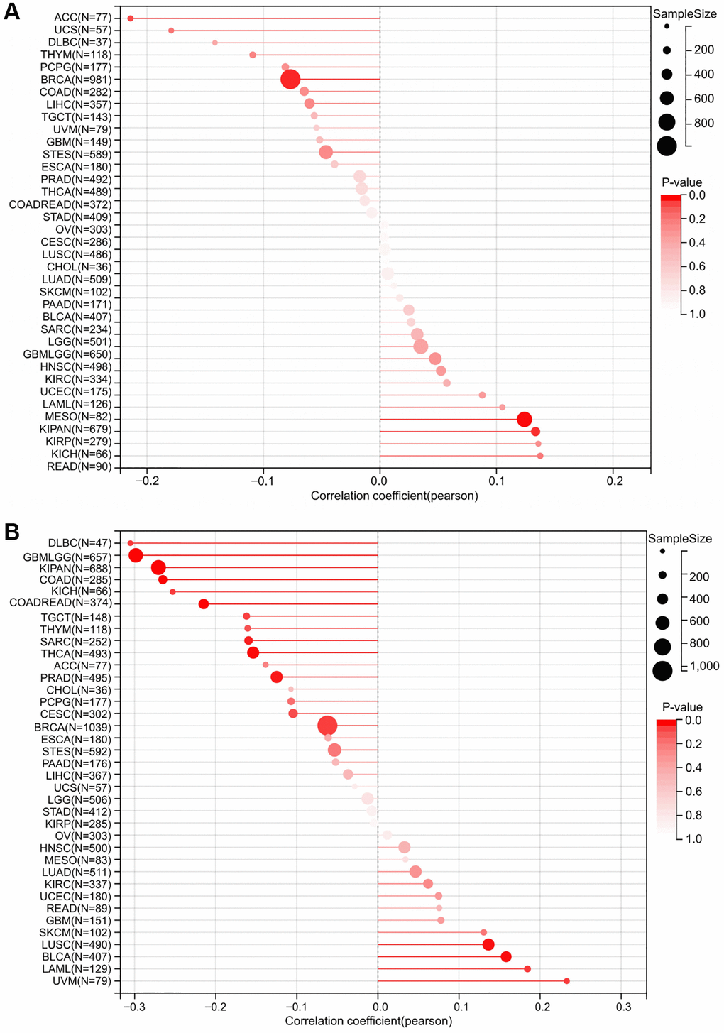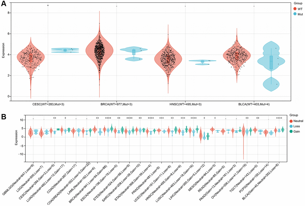 A Spearman relationship was performed between RNF135 single nucleotide variants (SNV) and mRNA in pan-cancer. We noticed a statistically significant difference in 1 tumor, CESC (P = 0.04) (Figure 4A). CESC (P = 1.3e-03), lung adenocarcinoma (P = 0.02), acute myeloid leukemia (P = 2.7e-03), BRCA (P = 8.6e-17), esophageal carcinoma (P = 4.8e-03), and stomach and esophageal carcinoma (P = 1.2e-07) exhibited significant differences in RNF135 copy number variations (CNV) and mRNA (Figure 4B).