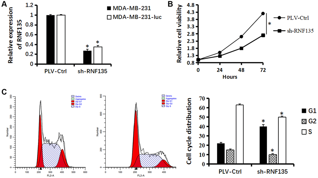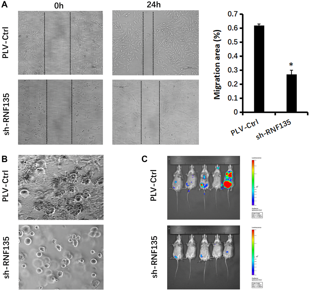 In order to evaluate the impact of RNF135, lentiviral shRNA vectors were used to suppress RNF135 expression in MDA-MB-231 and MDA-MB-231-luc cells in a stable and specific way. Expression levels were measured using quantitative real-time PCR (Figure 6A). CCK8 results showed that RNF135 down-regulation significantly suppressed the cell viability of MDA-MB-231 cells (Figure 6B). Flow cytometry data showing 39.86% G0/G1 phase cells in the shRNF135 cells and 22.28% G0/G1 phase cells in the PLV-Ctr cells suggest that RNF135 knockdown arrested the cell cycle in the G0/G1 phase (Figure 6C). Wound healing results showed that shRNF135 significantly decreased the migration capacity of MDA-MB-231 cells (Figure 7A). Reduced RNF135 expression in 3D cultures hindered MDA-MB-231 cell invasiveness (Figure 7B). Next, MDA-MB-231-luc cells were injected into the tail veins of SCID mice to examine the possible role of RNF135 in breast cancer metastasis (Figure 7C). We found that RNF135 knockdown significantly lowers the number of metastases compared to vector control.