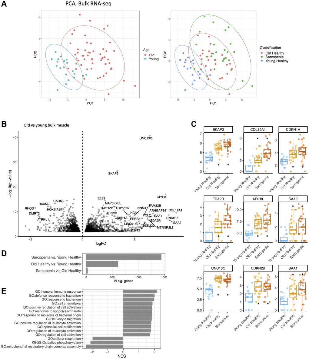 After quality control and processing using a standard RNA-seq pipeline (see Supplementary Materials), we performed bulk RNA sequencing on biopsies from all 72 subjects. We then performed principal component analysis (PCA) on the resultant gene expression datasets (Figure 1A). These analyses showed that gene expression at the bulk RNA level was largely distinct between younger versus older subjects (Figure 1A, Supplementary Table 1). We found 1442 differentially expressed genes (DEGs) between young versus sarcopenic, 613 between young versus old, and only 26 between old versus sarcopenic (Figure 1D). Samples from the older age group were marked by a statistically significant upregulation in the expression of several genes, including MYH8, COL19A1, EDA2R, CDKN1A and CDKN2B (Figure 1B, 1C). Conversely, expression of the following genes was lower with age: IGFN1, MTND3P10, ATRNL1 and PVALB. Pathway analysis of the bulk data revealed several upregulated pathways of immune response, and bacterial response and downregulation of mitochondrial respiration (Figure 1E). Sarcopenic and old muscle had similar signatures, compared to young muscle (Supplementary Figure 2A) (R2 = 0.9), but MYH8 was higher in the samples from sarcopenic compared to non-sarcopenic (Q < .05).