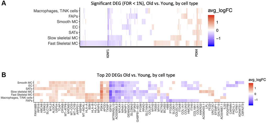 PDK4 is upregulated and IGFN1 is downregulated with age in all cell types