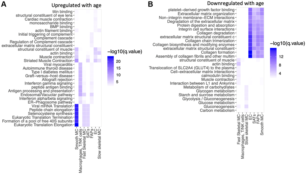 We then performed a pathway analysis of the age-related changes within each cell type (Figure 4A, 4B). Several pathways related to mRNA translation were upregulated with age in SMCs, SCs and fast SMC (Figure 4A). Antigen presentation, gamma interferon responses and complement cascades were upregulated in immune cells (Figure 4A). Muscle contraction pathways were upregulated in slow SMCs (Figure 4A). Conversely, pathways related to collagen and extracellular matrix (ECM) declined with age in ECs, SCs, FAPs and SMCs (Figure 4B). Glucose metabolism was downregulated in SMCs (Figure 4B). Table 2 shows a summary of differentially modulated genes involved in these pathways. Mitochondrial counts are frequently used as a proxy for quality control in single nuclei library preparation [50]. Therefore, we also tested the percentage of counts coming from the mitochondrial genome in young and old samples. For young samples 0.47% (0.27%–0.89%) of counts belonged to the mitochondrial genome, for old samples this number was 0.71% (0.37%–1.3%) (p < 2.2e10-16, Wilcoxon). This finding suggests a small but significant increase in mitochondrial counts from young to old samples, potentially implying more cell death, or “leakiness” in our aged biopsies.