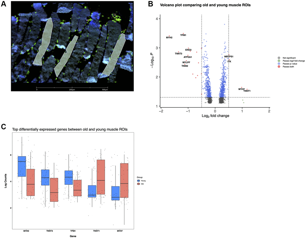 Paraffin embedded human skeletal muscle biopsies (4 young, 3 old) were profiled using the GeoMx Digital Spatial Profiler (nanoString), as previously described [96]. The standard GeoMx workflow was employed [96] 5 μm tissue sections were cut from the fresh-frozen tissues, and mounted on superfrost + glass slides and used within a week of cutting. Sections were then fixed in 10% NBF for overnight, then antigen retrieval followed by a proteinase K digestion to make available RNA within the tissue (1 mg/ml). GeoMx Hu WT probes (>18,000 protein coding genes) were then incubated overnight in a humidified chamber at 37°C to allow probes to anneal to expressed genes in the tissue. Morphology markers were then applied to the tissue for 1 hour in a humidity chamber; we used a directly conjugated antibody (FITC-525 nM) against desmin (for fiber detection), and for nuclei we used Syto83 (Cy3/568 nMM). Slides containing probes and morphology markers were then loaded into the DSP, and polygonal regions of interest within individual fibers were then drawn on each sample, with up to 4 tissue sections/slide, for a total of eighty ROI’s across the 7 samples. ROI counts were normalized by area. Then, PCA, differential gene expression testing was performed using a linear model on each gene, comparing ROIs from young and old.