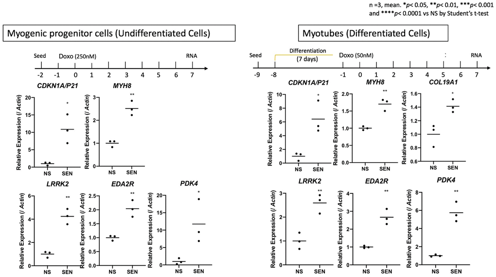 We wished to validate our findings regarding senescent cells arising with age in skeletal muscle. Therefore we tested the hypothesis that induced senescence in a muscle cell culture model would recapitulate some of the gene signatures we identified in CDKN1A-expressing populations of nuclei detected in old muscle samples. We induced senescence in cultured primary human skeletal muscle myoblast cells (HSMMs), comprised of both myogenic progenitor cells and myotubes, using the genotoxic agent doxorubicin, an increasingly used senescence inducer [67–69]. After 7 days post doxorubicin exposure, we determined expression of the following genes: CDKN1A, MYH8, COL19A1, LRRK2, EDA2R and PDK4 in senescent versus non-senescent cells by quantitative PCR (qPCR). In both cell types, all target genes were significantly upregulated in the senescent compared to non-senescent cells (Figure 7). These results suggest that cultured senescent cells derived from muscle exhibit some of the same markers we identified in nuclei derived from muscle biopsies of older frail individuals. We recently reported the small heat shock protein CRYAB as a critical mediator of senescence in multiple cell types from both mouse and human tissues including muscle [68]. CRYAB has been previously reported to increase with age, and specifically aggregate within human skeletal muscle [70]. We therefore measured CRYAB gene expression in individual nuclei via snuc-Seq, and determined small but significant increases in CRYAB gene expression in multiple cell types isolated from young versus old skeletal muscle (Supplementary Figure 7), consistent with both our cultured myoblast gene expression studies, and increased senescence with age within subpopulations of cell types comprising skeletal muscle.