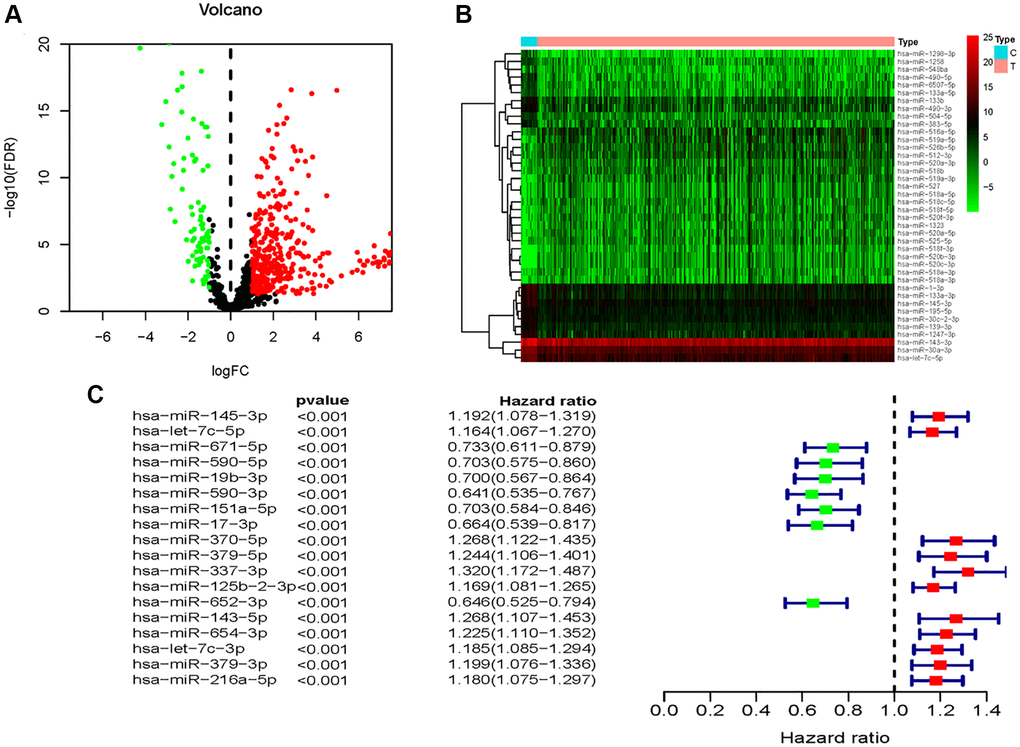 The mined differentially expressed miRNAs were subjected to univariate Cox regression analysis to explore whether there were associations between them and patients’ OS, and statistically significant miRNAs (p value < 0.001) were processed by multivariable Cox regression analysis. MiRNAs with statistically significance (p values < 0.05) in the multivariable Cox regression analysis were regarded as independent prognostic indicators for patients’ survival and were utilized to construct a 7-miRNA signature.