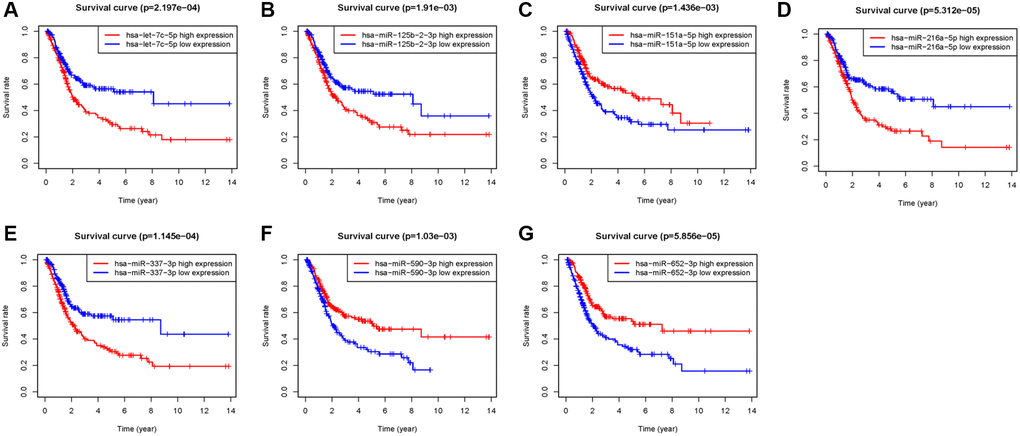 A total of 432 samples comprising, with complete clinicopathological data such as: age, sex, tumor grade, and TNM status, were included in our study. The “limma” package of the R language was utilized to explore the differentially expressed miRNAs between BC samples and non-tumor samples. miRNAs with |log2FC| of >1 and P < 0.05, were screened. The volcano plot identified 473 differentially expressed miRNAs (Supplementary Table 1), among which, expression of 379 miRNAs was upregulated and those of 94 miRNAs was downregulated (Figure 1A, Supplementary Table 1). The heatmap demonstrates unsupervised clustering of all the differentially expressed miRNAs (Figure 1B). Univariable Cox regression analysis between the differential expression miRNAs and survival data revealed 18 OS-associated miRNAs (Figure 1C). Multivariate Cox regression analysis filtered 7 miRNAs (miR-151a-5p, miR-216a-5p, miR-337-3p, let-7c-5p, miR-125b-2-3p, miR-590-3p, and miR-652-3p) that may predict prognosis of BC patients (Supplementary Table 2); four were negatively correlated while three were positively correlated to OS (Figure 2A–2G).