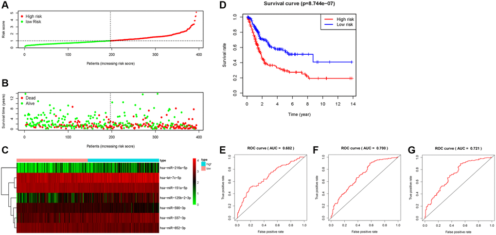 The scatter dot plot indicated that patients in low-risk group presented a longer survival duration (Figure 3B). The expression patterns of these seven miRNAs in the 413 BC patients are displayed in Figure 3C, indicating that high-risk scores tend to express high-risk miRNAs, while low-risk scores were the opposite. Similarly, an increased mortality rate was observed in the high-risk group (Figure 3D). The 7-miRNA signature yielded a satisfactory predictive ability, with 1-, 3-, and 5-years AUC values of 0.682, 0.700, and 0.721, respectively (Figure 3E–3G).