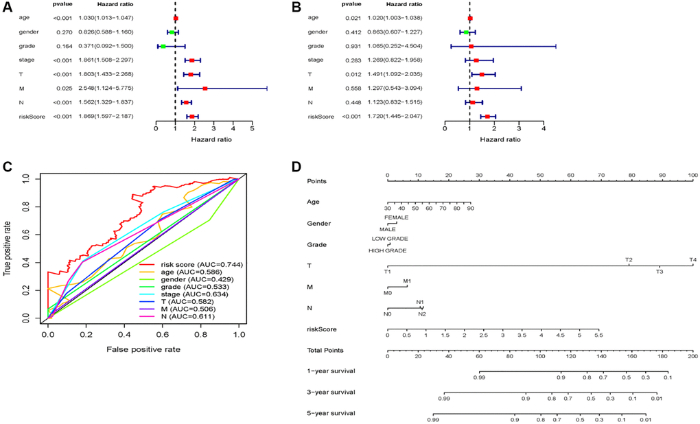 The univariate and multivariate Cox analyses were conducted in order to explore the prognostic value of the 7-miRNA-signature based on risk score in BC patients. The risk score of the 7-miRNA signature along with clinicopathological characteristics such as age, sex, grade, stage, and TNM status were used as covariates. Covariates that were significantly associated with survival in univariate Cox analysis (age [P < 0.001], stage [P < 0.001], T status [P < 0.001], N status [P < 0.001], M status [P = 0.025], and risk score [P < 0.001]) were subjected to multivariate Cox analysis. Results indicated that age (HR = 1.020, 95% CI: 1.003–1.038, P = 0.021) and risk score (HR = 1.720, 95% CI: 1.445–2.047, P < 0.001) are independent prognostic indicators (Figure 4A, 4B). Moreover, multi-parameter ROC curve analyses showed that the risk score achieved the most satisfactory predictive performance compared with clinicopathological characteristics, with an AUC value of 0.744, indicating that the 7-miRNA risk score is a promising prognostic biomarker (Figure 4C).